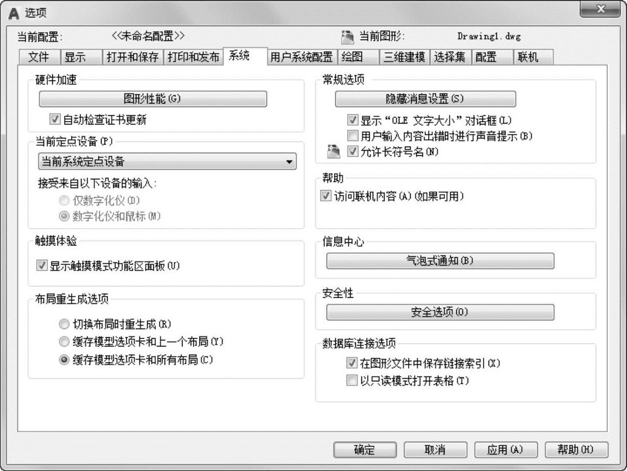 “选项”对话框的第5个选项卡为“系统”,如图2-4所示。该选项卡用来设置AutoCAD系统的有关特性,其中“常规选项”选项组用来确定是否选择系统配置的有关基本选项。