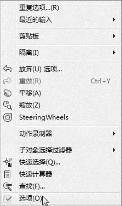 右键菜单:选项(右击,系统打开快捷菜单,快捷菜单中包括一些最常用的命令,如图2-3所示)。