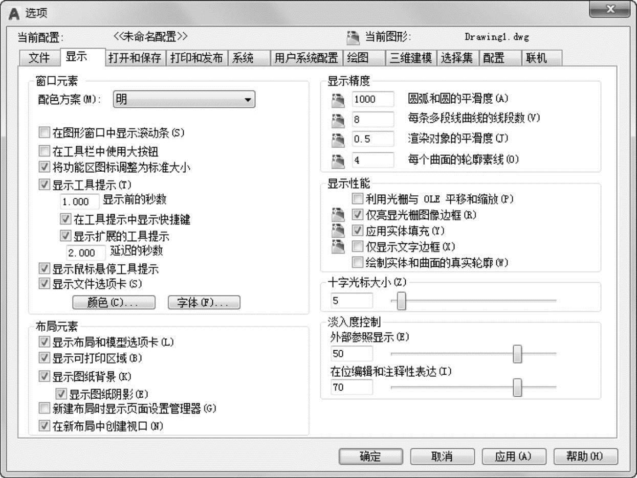 “选项”对话框的第2个选项卡为“显示”,该选项卡控制AutoCAD窗口的外观,如图2-5所示。该选项卡设定屏幕菜单、屏幕颜色、光标大小、滚动条显示与否、固定命令行窗口中文字的行数、AutoCAD的版面布局设置、各实体的显示分辨率及AutoCAD运行时的其他各项性能参数的设定等,部分设置如下。