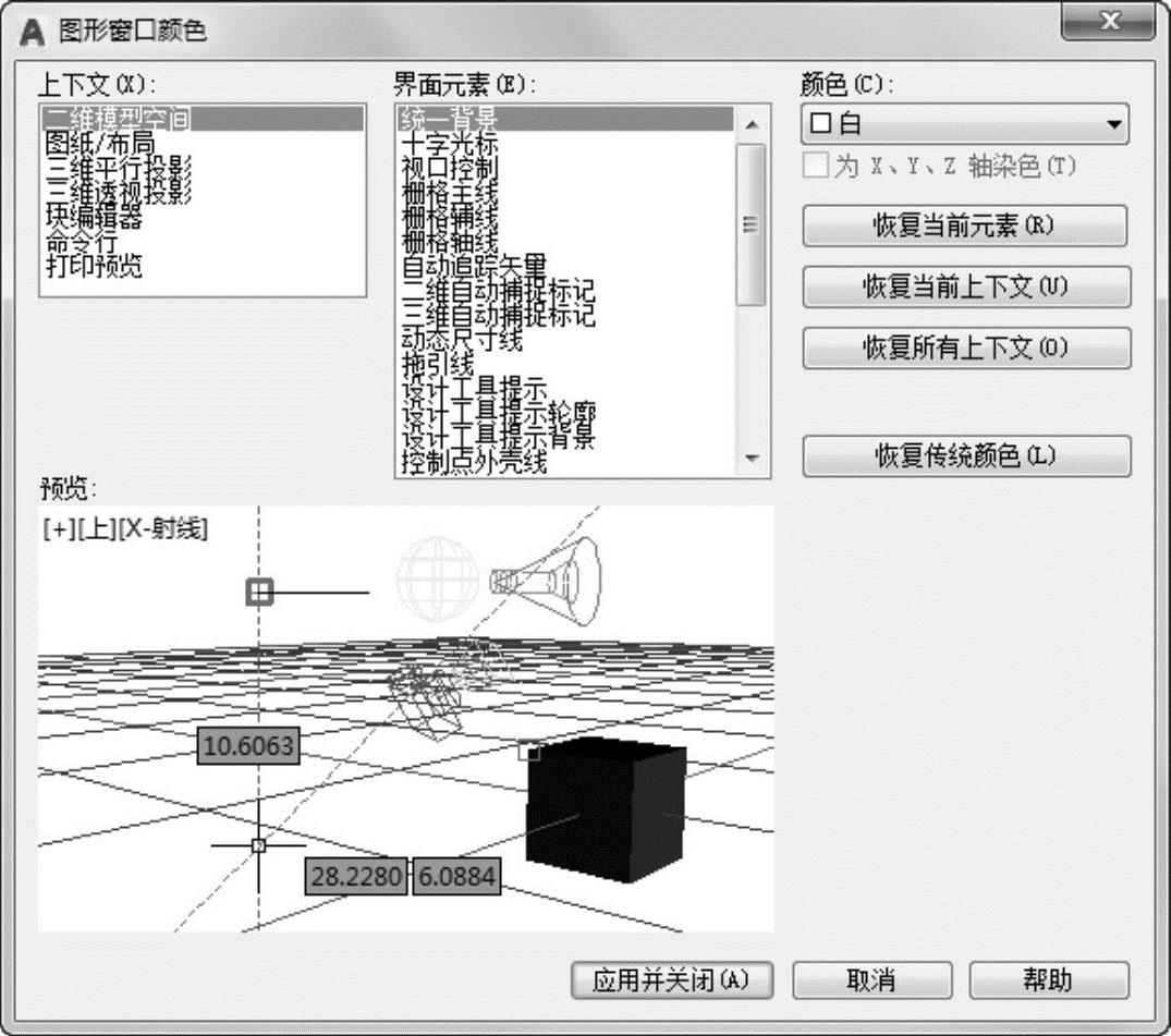 ②单击“图形窗口颜色”对话框中的“颜色”下拉列表框,在打开的下拉列表中选择需要的窗口颜色,然后单击“应用并关闭”按钮。此时AutoCAD的绘图窗口变成了窗口背景色,通常按视觉习惯选择白色为窗口颜色。