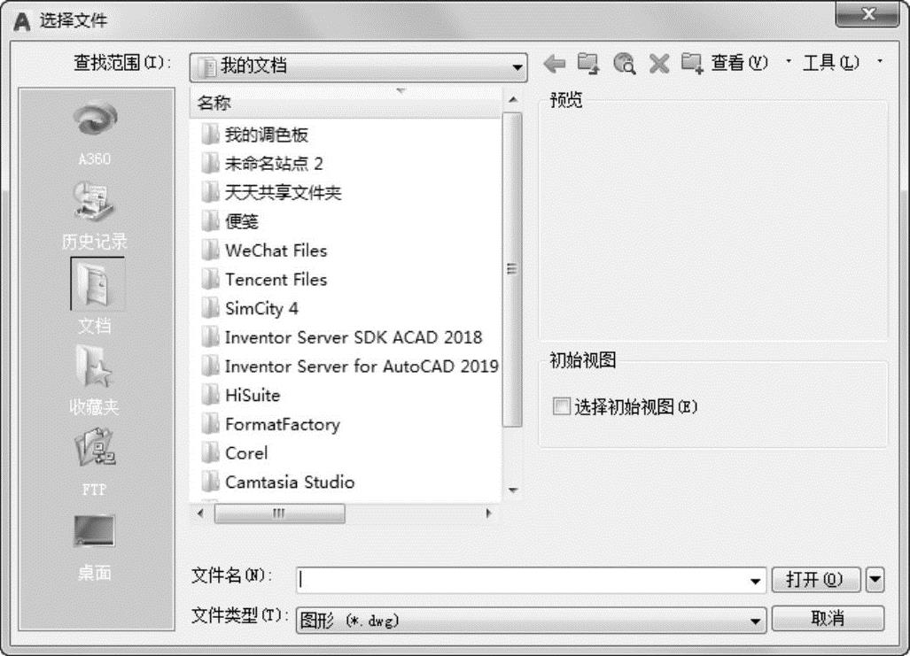 执行上述命令后,打开“选择文件”对话框(如图2-8所示),在“文件类型”下拉列表框中,用户可选.dwg文件、.dwt文件、.dxf文件和.dws文件。.dws文件是包含标准图层、标注样式、线型和文字样式的样板文件。.dxf文件是用文本形式存储的图形文件,能够被其他程序读取,许多第三方应用软件都支持.dxf格式。