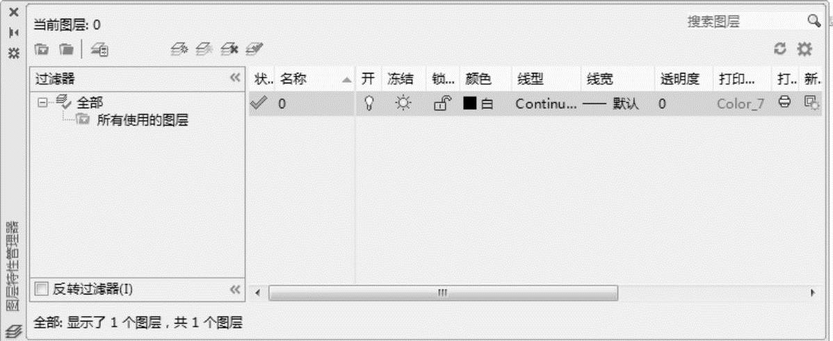 新建的CAD文档中只能自动创建一个名为0的特殊图层。默认情况下,图层0将被指定使用7号颜色、CONTINUOUS线型、“默认”线宽及NORMAL打印样式。不能删除或重命名图层0。通过创建新的图层,可以将类型相似的对象指定给同一个图层使其相关联。例如,可以将构造线、文字、标注和标题栏置于不同的图层上,并为这些图层指定通用特性。通过将对象分类放到各自的图层中,可以快速有效地控制对象的显示,以及对其进行更改。