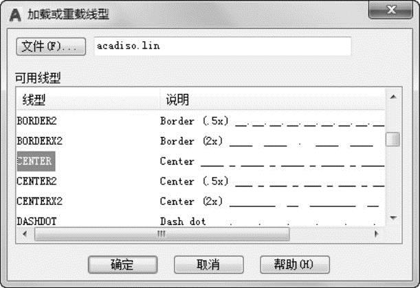 单击图层所对应的线型图标,打开“选择线型”对话框,如图2-19所示。默认情况下,在“已加载的线型”列表框中,系统中只添加了“Continuous”线型。单击“加载”按钮,打开“加载或重载线型”对话框,如图2-20所示。可以看到AutoCAD还提供了许多其他的线型。选择所需线型,单击“确定”按钮,即可把该线型加载到“已加载的线型”列表框中。也可以按住〈Ctrl〉键选择几种线型同时加载。