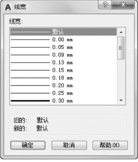 单击图层所对应的线宽图标,打开“线宽”对话框,如图2-21所示。选择一个线宽,单击“确定”按钮完成对图层线宽的设置。