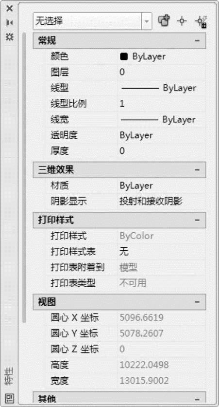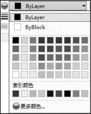 AutoCAD提供了一个“特性”面板,如图2-25所示。用户能够控制和使用面板上的“特性”面板快速地查看和改变所选对象的图层、颜色、线型和线宽等特性。“特性”面板上的图层颜色、线型、线宽和打印样式的控制,增强了查看和编辑对象属性的命令。在绘图屏幕上选择任何对象都将在面板上自动显示它所在的图层、颜色和线型等属性。