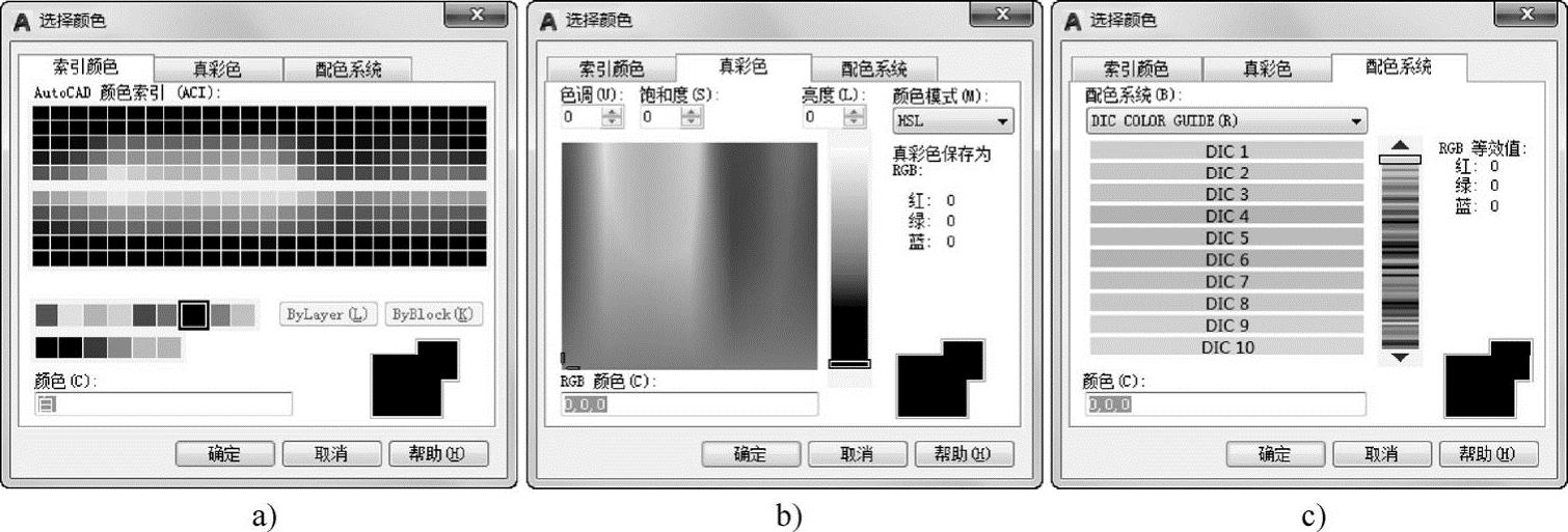 a)“索引颜色”选项卡 b)“真彩色”选项卡 c)“配色系统”选项卡