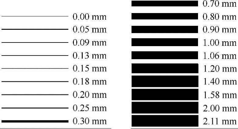 图层线宽的默认值为0.25mm。在状态栏为“模型”状态时,显示的线宽同计算机的像素有关。线宽为零时,显示为一个像素的线宽。单击状态栏中的“线宽”按钮,屏幕上显示图形线宽,显示的线宽与实际线宽成比例,如图2-22所示。但线宽不随着图形的放大和缩小而变化。“线宽”功能关闭时,不显示图形的线宽,图形的线宽均为默认宽度值显示。可以在“线宽”对话框选择需要的线宽。