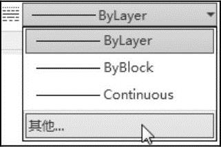 也可以在“特性”面板上的“颜色”“线型”“线宽”和“打印样式”下拉列表中选择需要的参数值。如果在“颜色”下拉列表中选择“选择颜色”选项,如图2-26所示。系统就会打开“选择颜色”对话框,如图2-18所示。同样,如果在“线型”下拉列表中选择“其他”选项,如图2-27所示。系统就会打开“线型管理器”对话框,如图2-23所示。