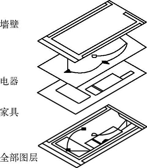 AutoCAD中的图层就如同在手工绘图中使用的重叠透明图纸,如图2-15所示。可以使用图层来组织不同类型的信息。在AutoCAD中,图形的每个对象都位于一个图层上,所有图形对象都具有图层、颜色、线型和线宽4个基本属性。在绘制的时候,图形对象将创建在当前的图层上。每个CAD文档中图层的数量是不受限制的,每个图层都有自己的名称。