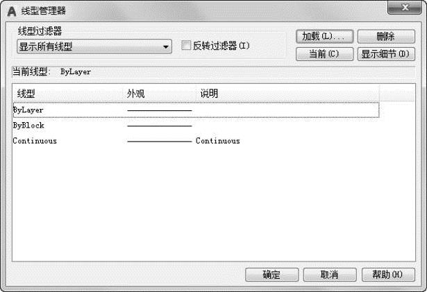 执行上述命令后,系统打开“线型管理器”对话框,如图2-23所示。该对话框的使用方法与图2-19所示的“选择线型”对话框类似。