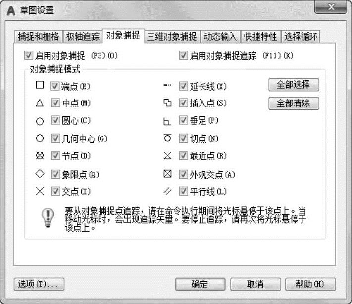 图3-22 “草图设置”对话框的“对象捕捉”选项卡