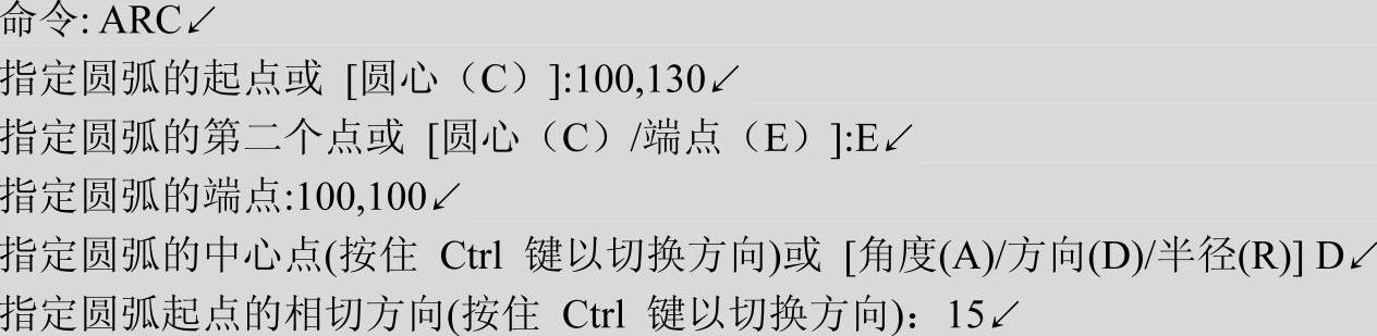 3)单击“绘图”工具栏中的“圆弧”按钮 ,绘制另一段圆弧,命令行提示与操作如下。