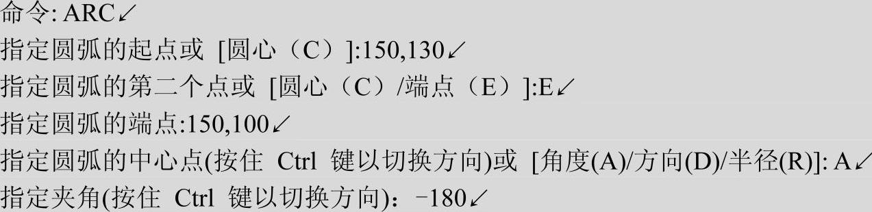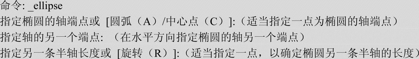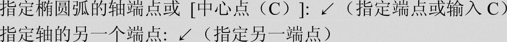 该选项用于创建一段椭圆弧,与“工具栏:绘制→椭圆弧”功能相同。其中第一条轴的角度确定了椭圆弧的角度。第一条轴既可定义为椭圆弧长轴也可定义为椭圆弧短轴。选择该项,命令行提示如下。