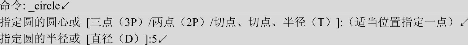 1)绘制圆。单击“默认”选项卡“绘图”面板中的“圆”按钮 ,在屏幕中适当位置绘制一个半径为5的圆,命令行中的提示与操作如下。