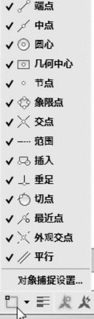 2)设置对象捕捉和对象追踪。将鼠标指针移动到状态栏“对象捕捉”按钮 并右击,打开快捷菜单,选择其中的“对象捕捉设置”命令,如图3-21所示,打开“草图设置”对话框的“对象捕捉”选项卡,如图3-22所示;选择“启用对象捕捉”复选框,单击“全部选择”按钮,这样所有的对象捕捉模式都被选上了。单击“极轴追踪”选项卡,如图3-23所示,选择“启用极轴追踪”复选框,“增量角”保持默认的45°,单击“确定”按钮关闭对话框。