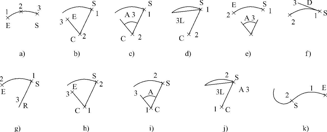 1)用命令行方式绘制圆弧时,可以根据系统提示单击不同的选项,具体功能和单击菜单栏中的“绘图”→“圆弧”中子菜单提供的11种方式相似。这11种方式绘制的圆弧分别如图3-31a~k所示。