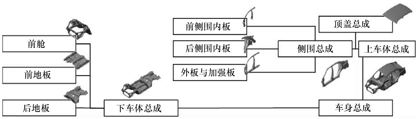 如前所述,车身是由众多钣金件连接(焊接或铆接等)而成,根据连接关系可以进行结构拆分。合理的结构拆分有利于优化车身连接生产工艺,有利于提高模块化设计与制造水平。图1-5为某合资车型的车身结构拼接顺序,可以看出整个白车身结构由下车体总成与上车体总成焊接而成。下车体焊接顺序是先将前舱、前地板与后地板分别焊接成整体,然后拼接成下车体总成。上车体则是由前侧围内板、后侧围内板与外板总成(含加强板)拼接成侧围总成,加上顶盖总成制成上车体总成。上、下车体总成最后拼接成完整的白车身总成。
