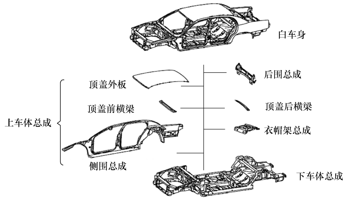 广义上的汽车车身,包含金属白车身(Body in White, BIW)、开闭件以及相关附件,本书研究的车身参数化建模与概念设计主要针对白车身结构件,因此本书在介绍车身组成时,仅指白车身结构件。