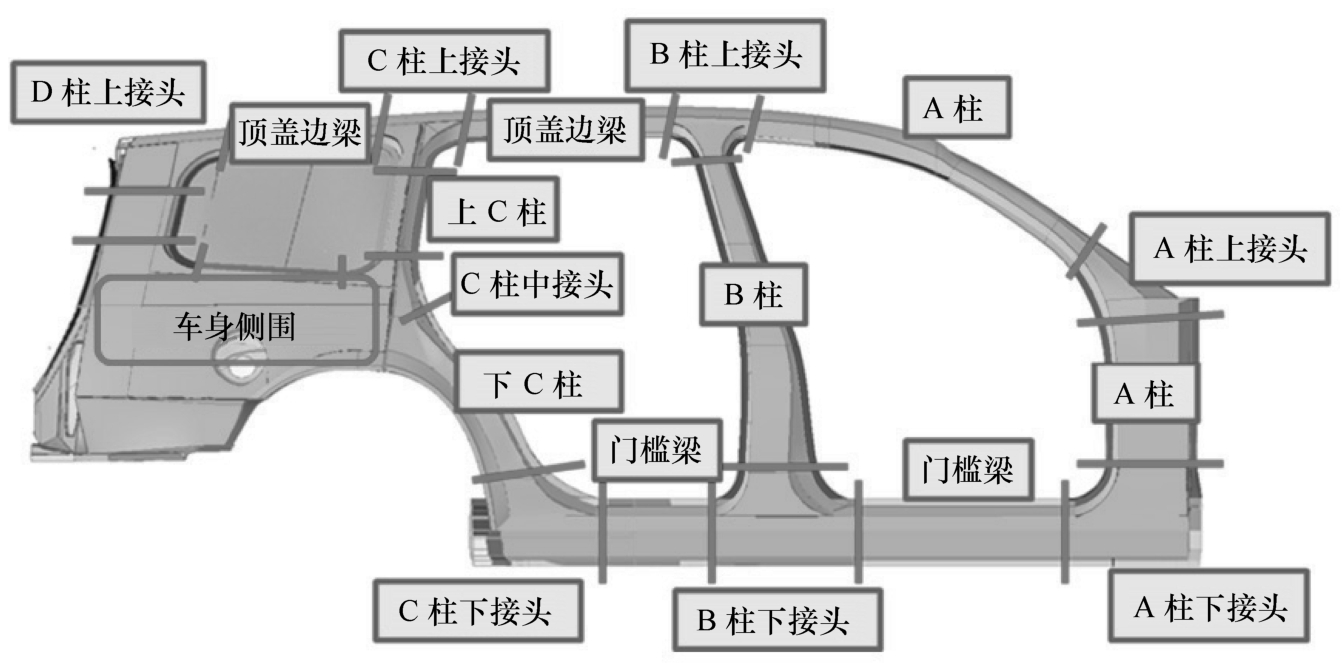 (4)顶盖边梁 顶盖边梁连接着上述各立柱,与立柱交叉形成相应的接头结构。顶盖边梁上需要安装顶盖总成,对顶盖起重要的支撑作用。在性能上,顶盖边梁对车身结构刚度和抗顶压性能影响较大,在正面和侧面碰撞中能分散碰撞能量,因此截面设计不宜过小。