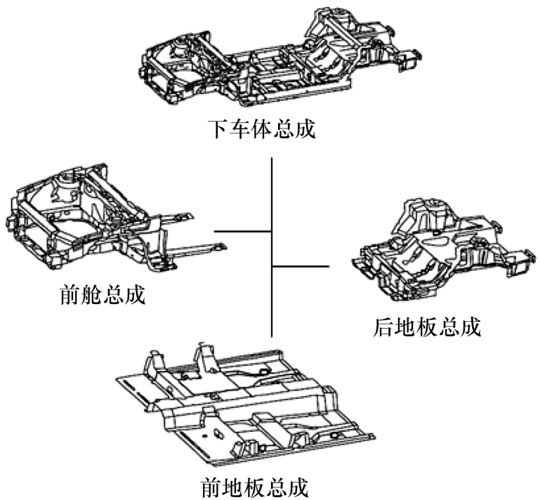 由于造型、空间和驾驶员视野,以及乘员进出性等美观与人机工程性能需求,上车体各结构的尺寸受限,这种趋势越来越明显。由于空间上对上车体的限制,在进行结构设计时,应更加注重下车体结构的加强设计。一般来讲,承载式车身的下车体结构是其主要的承载结构,同时也属于平台总成,当进行平台开发时,需同时满足不同车型对各项性能的要求,因此经常采用纵横梁交错结构,保证既满足功能需求,又能达到规定的性能要求。下车体一般可分为前舱总成、前地板总成和后地板总成,如图1-9所示。