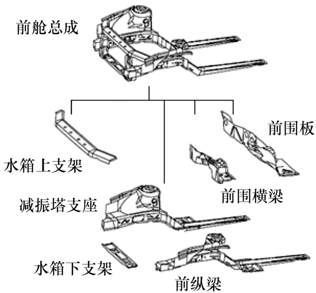 前舱即发动机舱,对于具有承载式车身的汽车而言,前舱总成结构需要安装动力总成、冷却水箱和风扇等舱内零件,也需安装前副车架与前悬架等底盘结构。结构上,从前到后一般可分为水箱框架(上、下支架)、前纵梁及其延伸梁、减振塔支座、前围横梁与前围板等子总成,如图1-10所示。