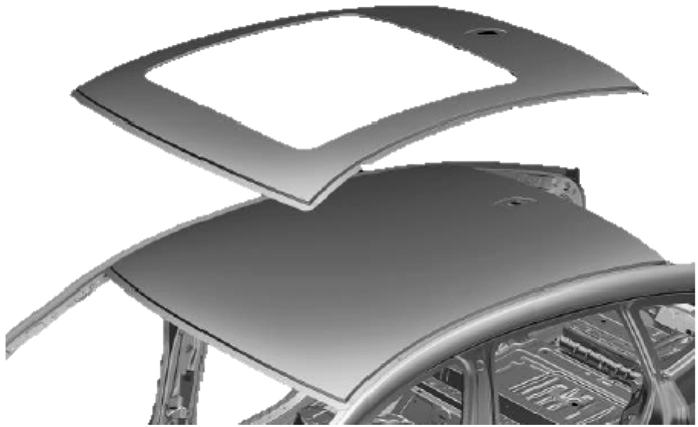 根据配置的需要,顶盖上可能安装有不同尺寸的天窗,如图1-8所示,此时需设计对应的加强安装结构。由顶盖横梁、前后横梁、顶盖外板组成的总成,若与侧围框架形成对应的环状结构,则有利于提高车身的结构刚度、模态频率和碰撞等各项性能。在白车身设计和优化时,应尽可能地保持环状结构的完整性,提高材料利用率。