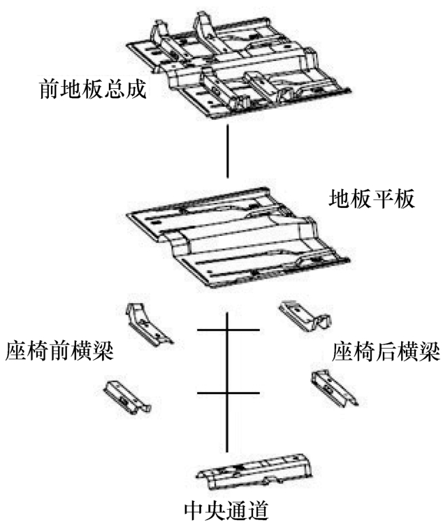 前地板总成在下车体的中间位置,与上车体前围等总成围合成完整的乘员舱,其上一般需要安装前排座椅与前后连通的管路线束等零件。前地板总成如图1-11所示,主要分为地板平板、座椅安装横梁(前、后横梁)和可能有的中央通道及其加强结构。