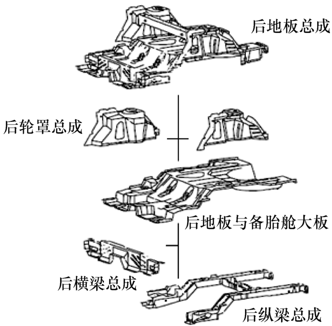后地板总成处于下车体后端,是行李舱或备胎舱的主要组成部分,对于承载式车身结构,其上需要安装后副车架与悬架、油箱、备胎以及后座椅等总成结构。后地板总成一般包含后地板与备胎舱大板、后轮罩总成、后横梁总成与后纵梁总成等,如图1-12所示。
