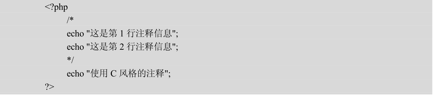上面代码虽然使用echo输出语句分别输出了“这是第一行注释信息”“这是第2行注释信息”和“使用C风格的注释”,但是因为使用了注释符号“/*…*/”将前面两个输出语句注释掉了,所以没有被程序执行。