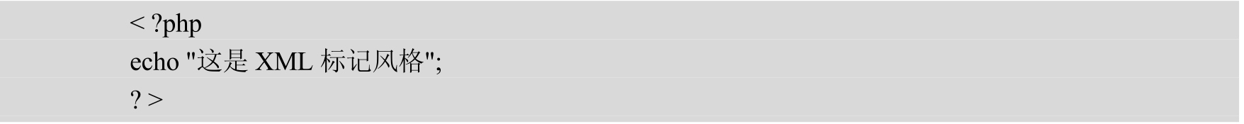 从上面的代码中可以看到,XML标记风格是以“<?php”开始,以“?>”结尾的,中间包含的代码就是PHP语言代码。这是PHP最常用的标记风格,推荐使用这种标记风格,因为它不能被服务器禁用,在XML、XHTML中都可以使用。
