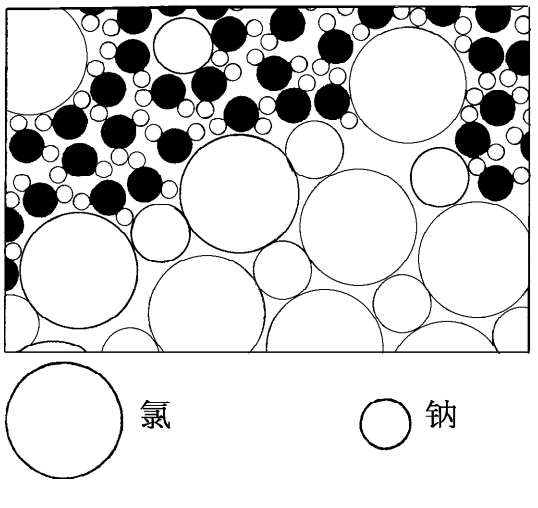 现在我们来考虑另一种过程。在图1-6中,我们从原子的观点来看固体在水中溶解。如果我们把结晶盐粒丢入水中,会出现什么情况呢?食盐是一种固体,一种晶体,并且具有“食盐原子”的有规则的排列。图1-7是普通食盐——氯化钠的三维结构图。严格地说,这种晶体不是由原子而是由我们所谓的 离子 构成的!离子就是带有额外电子的原子,或失去一些电子的原子。在食盐晶体中我们发现了氯离子(带有一个额外电子的氯原子)和钠离子(失去一个电子的钠原子)。在固态食盐中,所有的离子都由于电的作用而吸引在一起。但是当我们把食盐投到水里后就会发现,由于带负电的氧和带正电的氢对离子的引力,有一些离子离散了。在图1-6中有一个氯离子松开来了,其他的原子则以离子的形式在水中浮动。这张图画得相当仔细。例如,注意水分子中的氢原子一端大多靠近氯离子,而在钠离子周围所见到的大多是氧原子的那一端,因为钠是正的,而水的氧原子一端是负的,它们之间有电的吸引。我们能不能从这幅图画中看出盐究竟是 溶解于 水中,还是从水中 结晶出来 ?当然,我们看不出来,因为当某些原子离开晶体时,另一些原子又重新聚集到晶体上。整个过程是一个 动态过程 ,犹如蒸发的情况,它取决于水中的盐的含量是超过还是少于形成平衡所需要的数量。所谓平衡我们指的是这种情况,即原子离开晶体的比率正好与回到晶体的比率相同。假如在水中几乎没有什么盐,离开的原子就比回去的原子多,食盐就溶解。但反过来讲,如果水里的“食盐原子”太多,那么回去的就多于离开的,食盐就结晶。