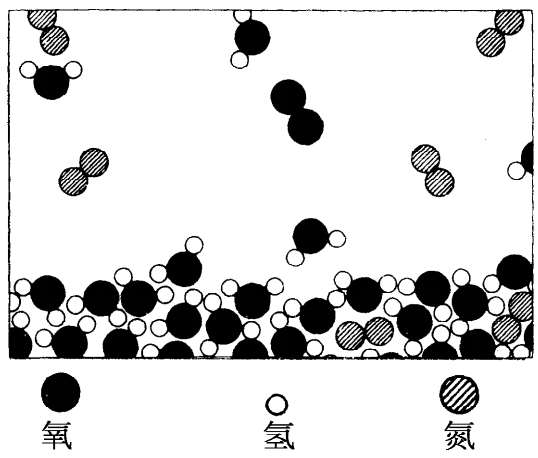 当然,你们应当了解,刚才所说的那个过程实际上要比我们所指出的更为复杂。不仅水分子进入空气,不时还有氧分子或氮分子跑到水里,“消失”在水分子团中,这样空气就溶解在水中;氧和氮的分子进入水中,水里就有了空气。如果我们突然抽走空气,那么空气分子出来的要比进去的来得快,这样就形成了气泡。你们可能知道,这对潜水员是很不利的。