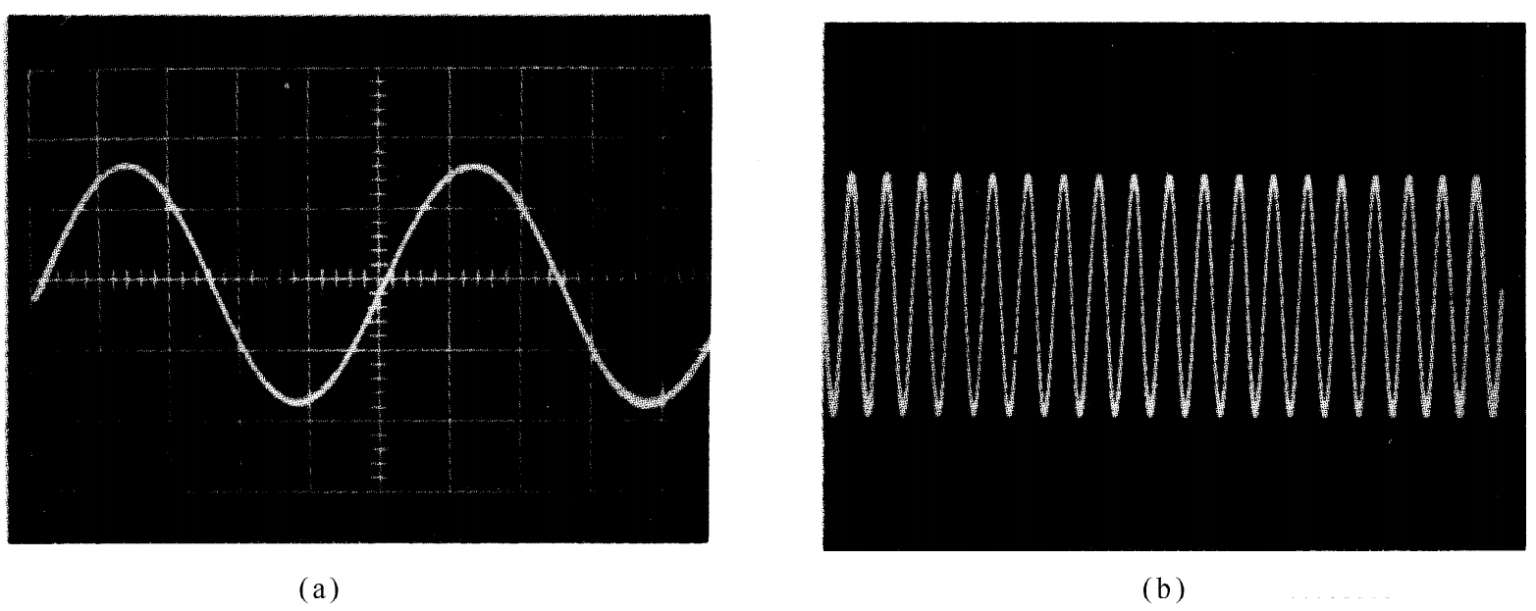 图5-2 示波器屏上的两个图像。在(a)中,展示的是示波器与一个振荡器相连接时的波形;在(b)中,展现了它与另一个其周期只有前者十分之一的振荡器相连接时的波形