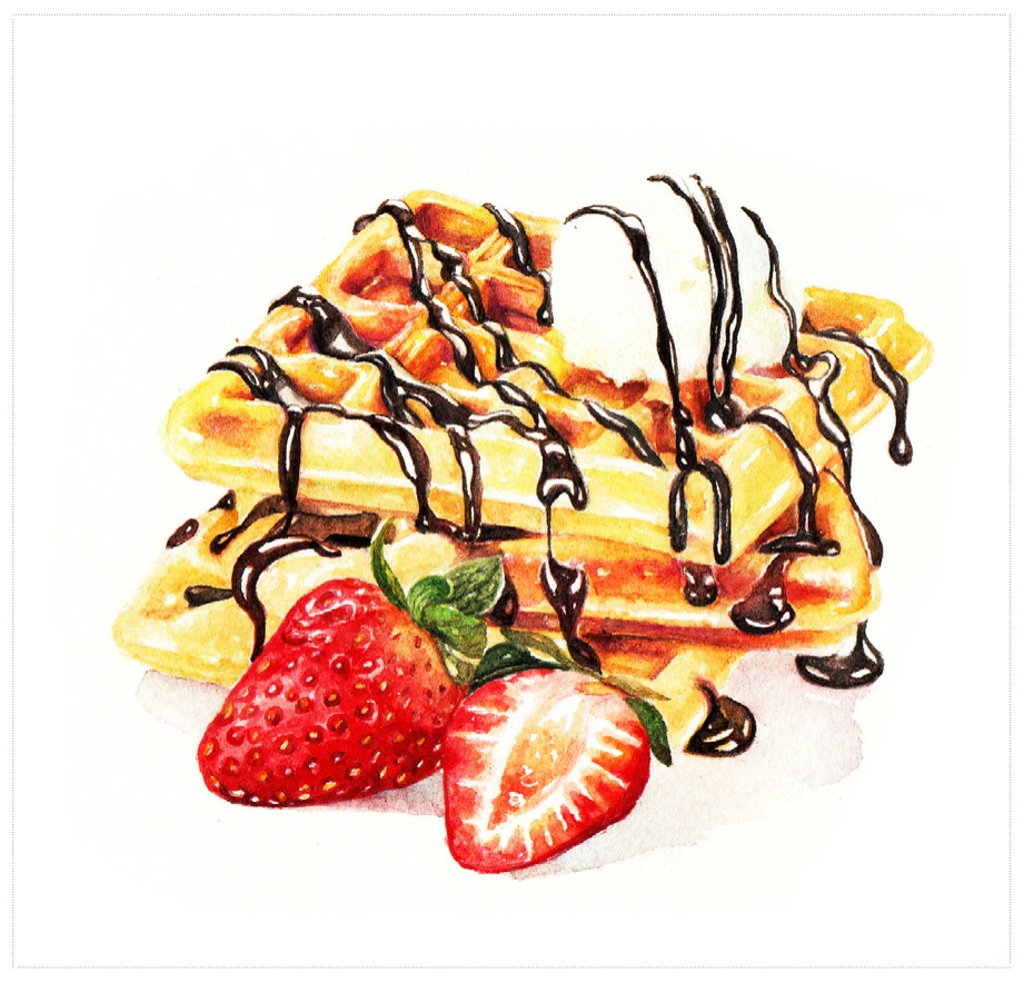 我们今天主要研究的是,当水彩遇到美食,应该如何用水彩画出令人垂涎欲滴的甜点。图 1.1-3 为水彩绘制的草莓冰激凌华夫饼。