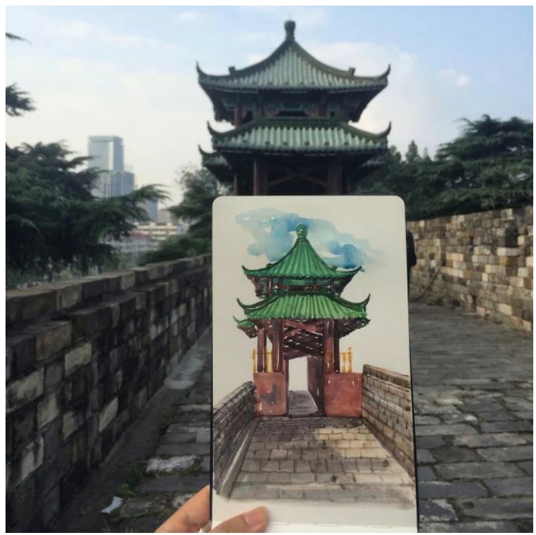 当我们用水彩作为记录生活的一种工具,如图 1.1-1 中为水彩写生。写生不同于画照片,可以观察到更多照片中看不到的细节和颜色,初学者更应该多画写生。