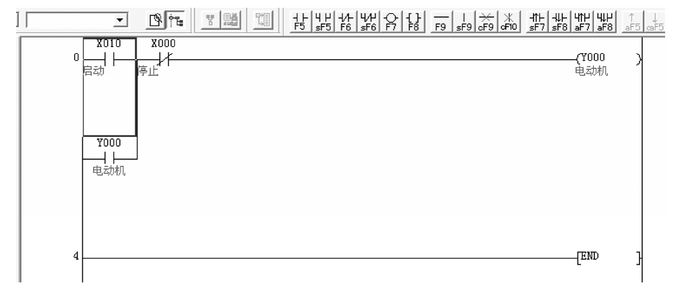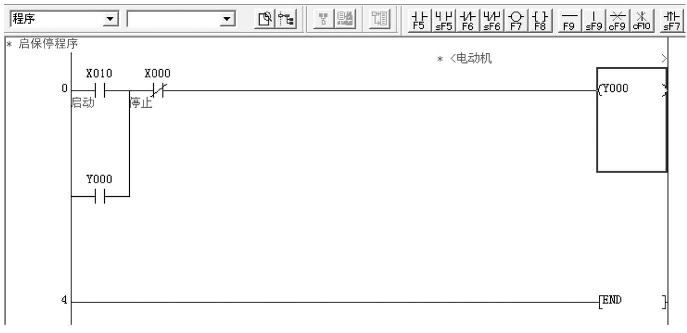 现仍以“启保停”程序为例,将光标移动输出线圈 Y000 处,双击光标,在对话框中填入“电动机”字样,单击“确定”按钮。程序行变灰色状态,再次进行程序编译,这时,输出线圈的注解说明出现在Y000的左上方,如图2-25所示。