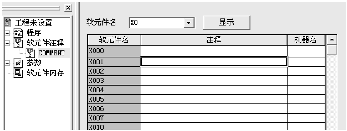 在工程栏内(梯形图左侧栏),单击“软元件注释/COMMENT”,出现如图 2-26 所示批量表注释。