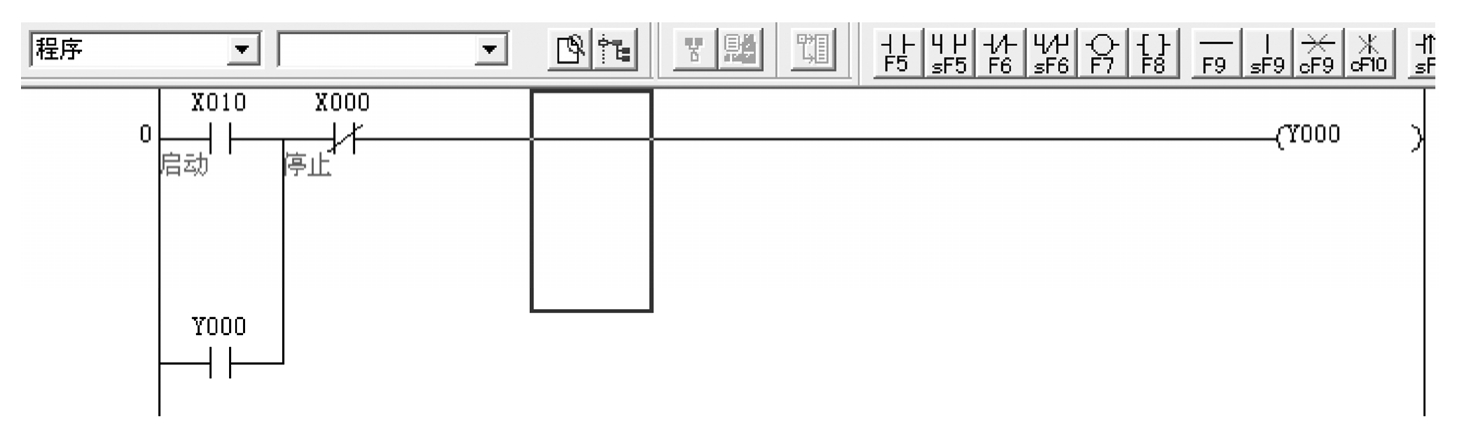 在框内填上“启动”(假设 X010 为启动按钮输入点),单击“确定”按钮,注释文字出现在X010下方。把光标移到X000处,双击光标,在对话框内填上“停止”,单击“确定”按钮,文字“停止”出现在X000下方,如图2-21所示。