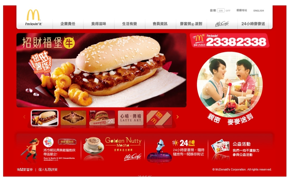 人们都倾向于选择一些具有较高品牌知名度的商品,拥有一定品牌知名度的网站更容易获得用户的信任和青睐。在该知名快餐连锁品牌的宣传网站中,通过简捷的布局,在页面中重点突出最新推出的产品以及服务电话,并没有过多的介绍,用户基于对品牌的信任,通常看到喜欢的产品就会立即打电话订购。