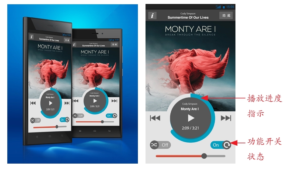 在该音乐播放APP界面中,为用户的交互操作给予了明确的指示。首先各播放控制图标运用了通俗易懂的简捷风格表现,并且通过色彩与时间文字相结合的方式来提示播放进度,而功能开关按钮则通过不同的色彩来区分开启和关闭的状态,这样在用户的交互操作过程中非常易理解、易操作。