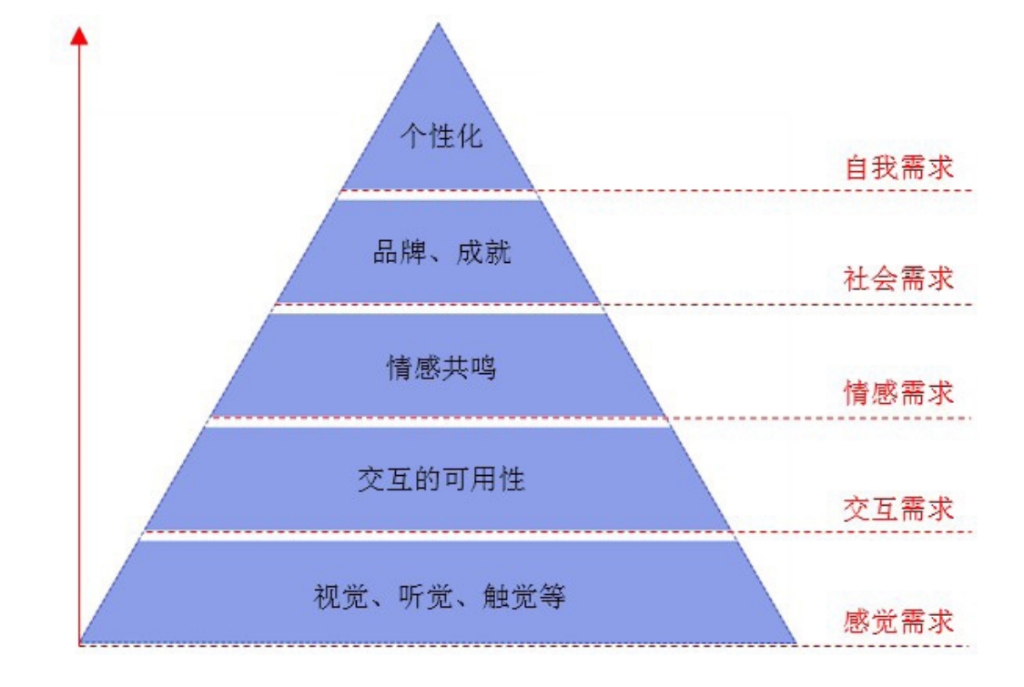在马斯洛关于人的5个需求层次的基础上,互联网产品的用户体验同样可以分为5个需求层次,从低至高分别是感觉需求、交互需求、情感需求、社会需求和自我需求。