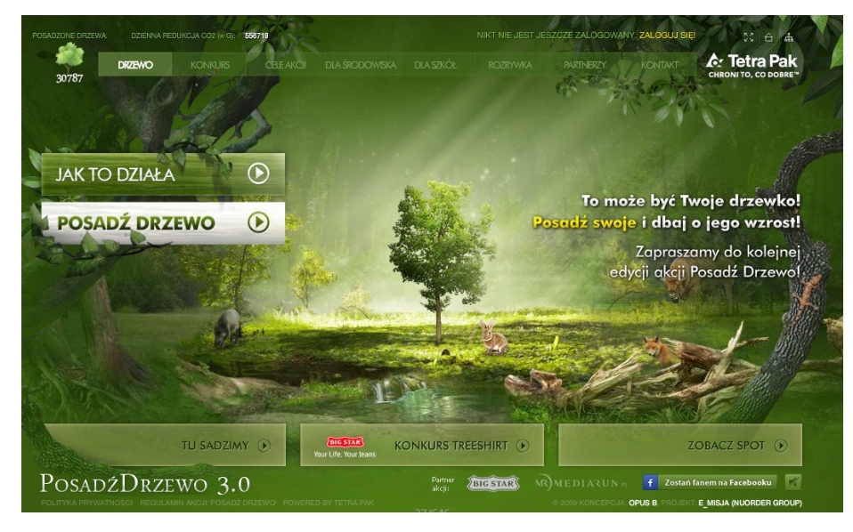 在该网站页面中,信息内容较少,着重通过视觉效果来感染用户。将页面的整体视觉效果设计为茂盛的大森林,并且为页面添加了大森林的背景音乐,从视觉和听觉等多个方面渲染出森林的氛围,使浏览者仿佛置身于森林当中,从而很好地吸引用户的关注。