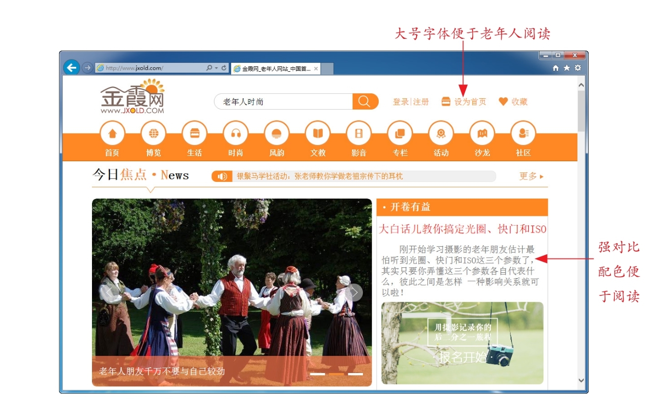 “金霞网”是一个专门针对老年人的网站,该网站专门针对老年人视力较弱的情况,使用了大号的字体,并且老年人对于色彩的分辨能力也相对较弱,该网站页面的设计并没有使用过多的色彩,使用高对比的白底黑字来表现网站内容。在年轻人看来,这样的网站视觉效果上有些简陋,但是其相应的设置却是充分考虑了老年人群的特点。