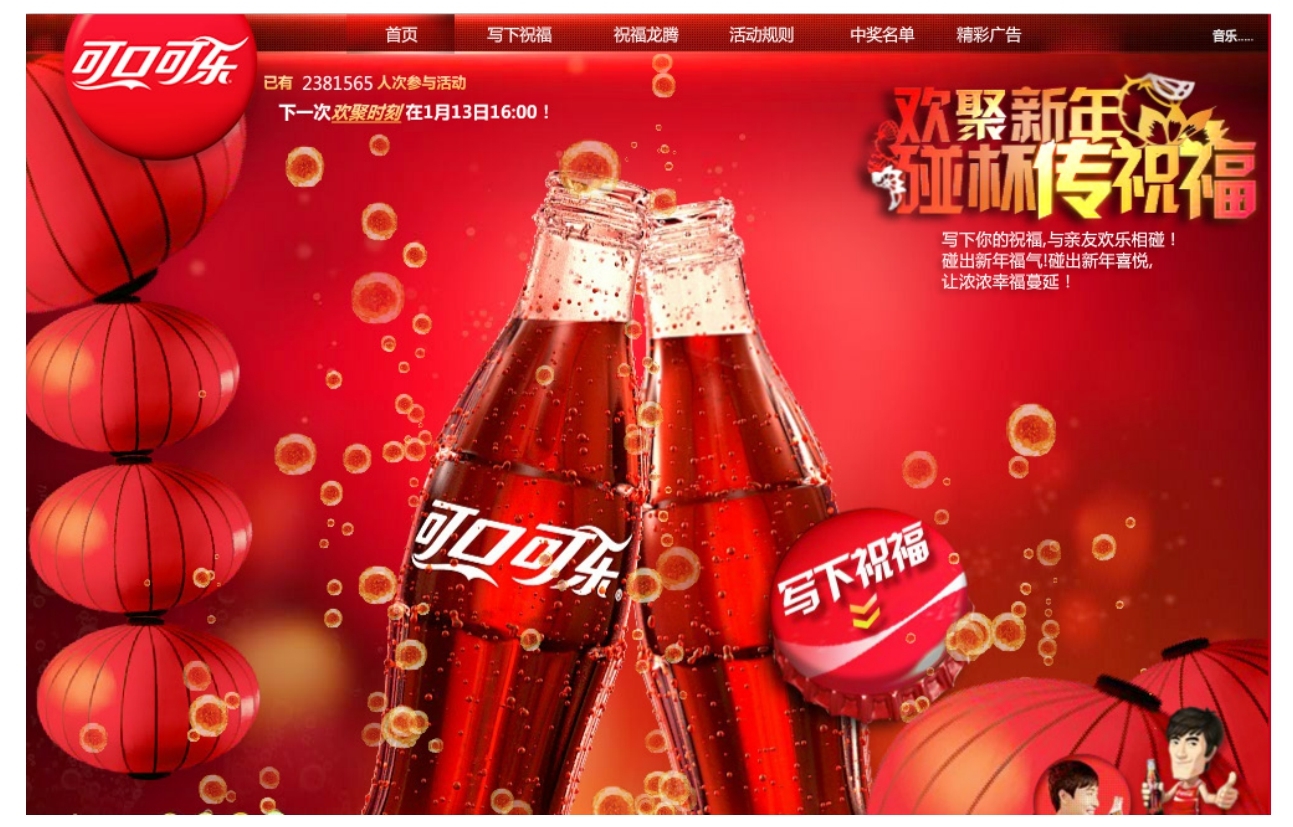 这是可口可乐为配合中国传统春节推出的活动宣传网站,整个网站使用红色作为主色调,而红色也正好与“可口可乐”品牌的主色调相统一,点缀少量的黄色,再搭配富有传统节日气息的灯笼,表现出浓浓的节日氛围,非常符合中国的传统文化,更容易使中国人接受。