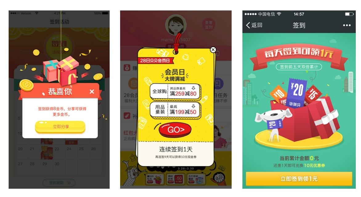 许多电商类网站,特别是电商类APP都会添加用户登录签到的功能,通过登录签到可以奖励积分甚至是现金优惠券,极大地提升了用户参与的热情,从而保持用户的活跃度,进而促进用户在网站中的消费。