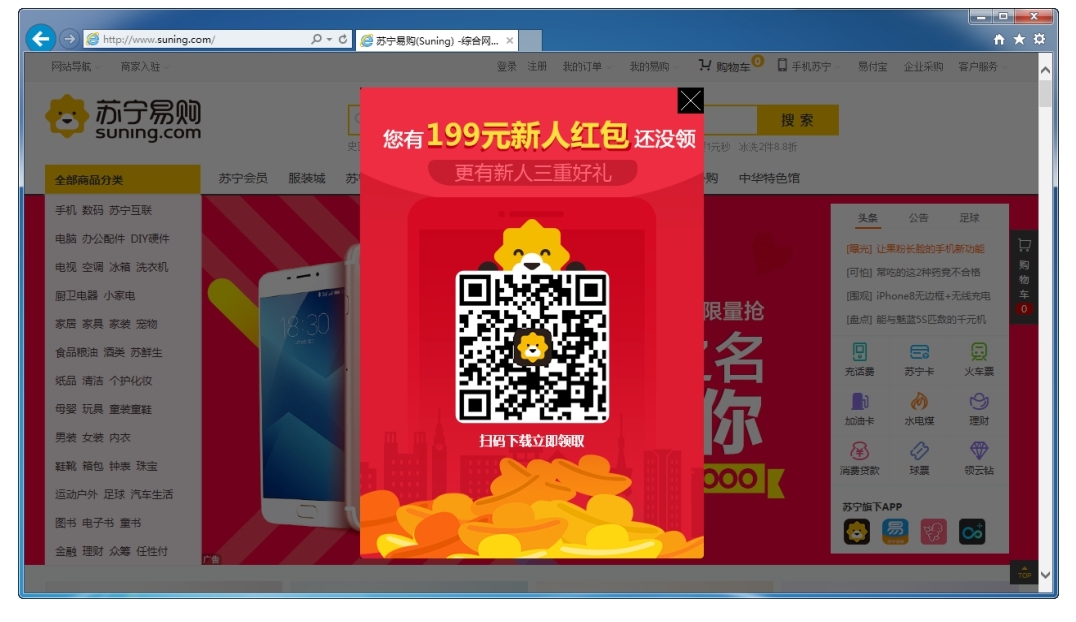 当浏览者打开“苏宁易购”网站时就会自动弹出新人红包领取的提示,很大程度上吸引了初次来到该网站的用户领取红包,并最终促成在网站中的消费。当然网站在不同时期会根据节假日的特点适当地推出相应的促销活动,用户同样可以领取相应的优惠券,刺激用户在网站中进行消费。