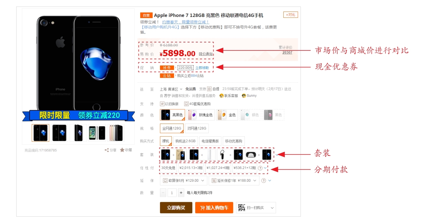 这是“苏宁易购”中某商品的详情页面,在商品名称的下方直接给出市场价与商城价的对比,让用户感受到最直接的价格优势。在价格的下方又直接给出现金优惠券,继续刺激用户下单购买商品,再往下还有套装和分期付款,这些方式都是为了进一步地促进用户消费。