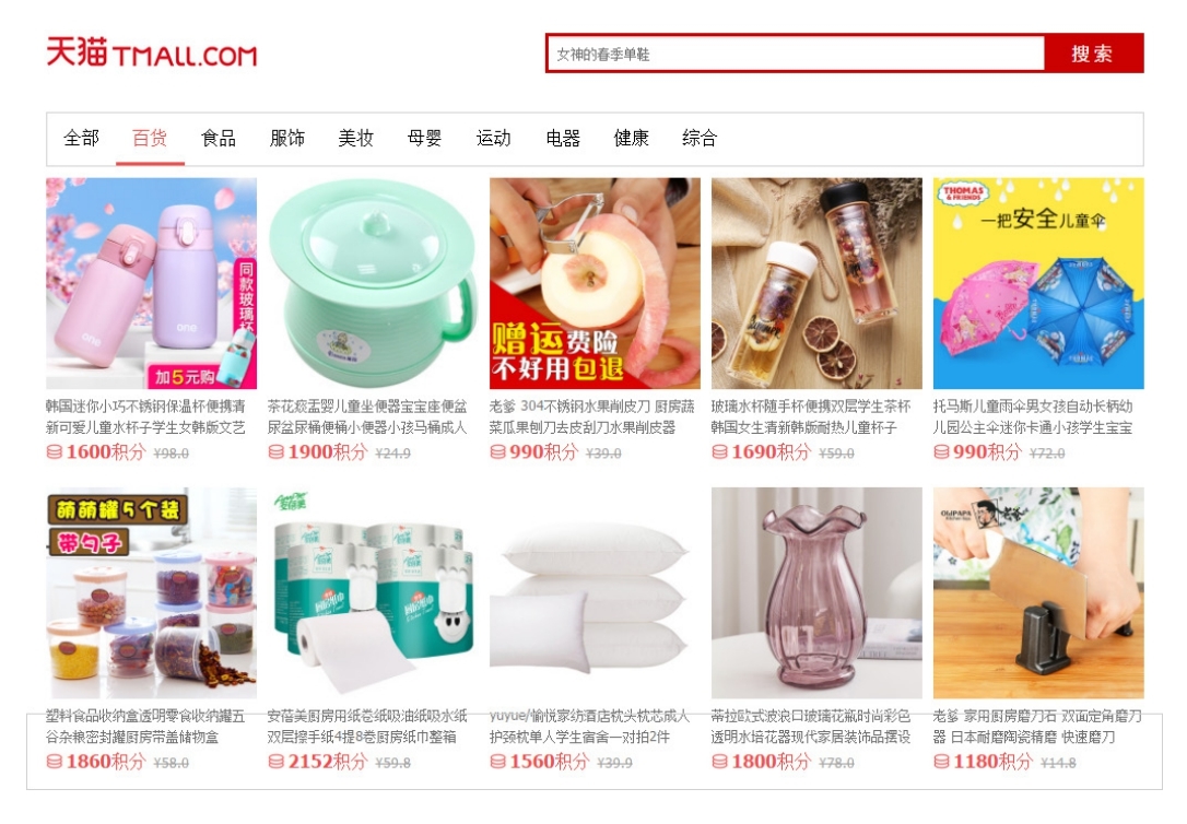 这是“天猫”网站的会员积分商城页面,将可以使用积分进行兑换的商品进行分类,便于用户查找,用户可以通过会员积分兑换商品,大大促进了会员的忠诚度。并且“天猫”网站的会员积分还可以进行抽奖,充分体现了网站会员积分的价值。