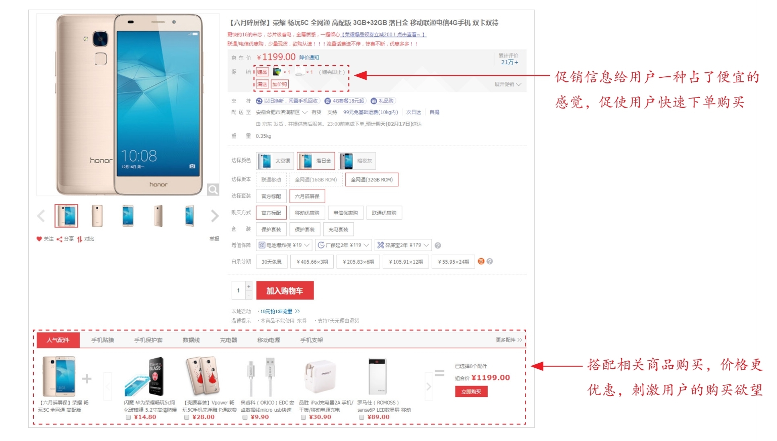 这是“京东”网站某款商品的详情页面,可以看到在商品价格下方的“促销”信息中包含“赠品”“满送”“加价购”等促销信息,这些都能够有效地促使用户尽快下单购买。在商品基本信息的下方,特意设置“人气配件”栏目,根据当前商品推荐相应可搭配购买的商品进行打包销售,当然打包销售的价格