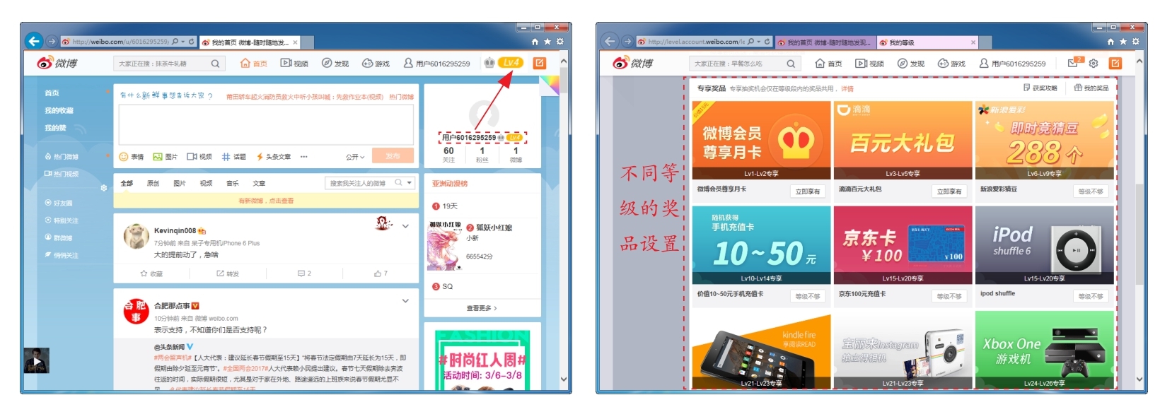 网站中会员等级的存在主要是用于回馈网站的忠实用户,鼓励用户多进行相应的操作。例如“新浪微博”中的等级激励机制,当用户登录到“新浪微博”网站,在用户名的右侧就会以图标的形式显示出用户的会员等级,在社交平台中会员等级可以看作身份的象征。单击会员等级图标可以进入到“我的等级”页面,在该页面中可以看到当前用户的等级,以及完成哪些操作可以提升等级,最重要的是在页面下方列出了不同会员等级可以兑换的奖品,等级越高,奖品价值越大,这样就激励用户在微博平台中不断完成任务,提升等级,有效地提高了用户参与的积极度。